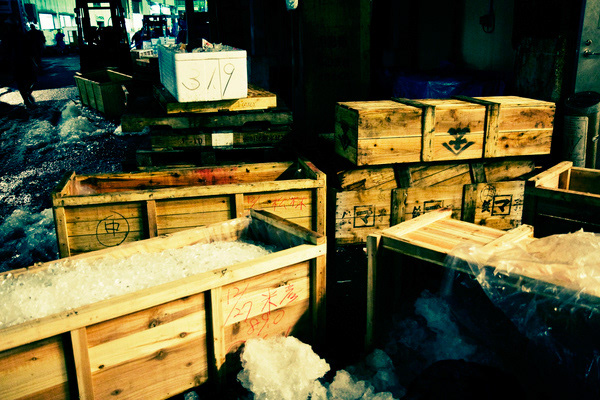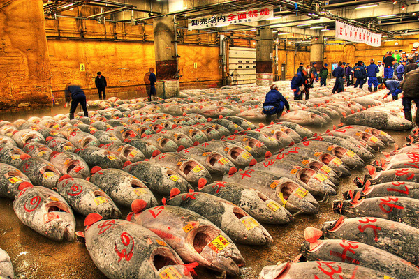 Fish are lined up around 5 AM for the daily auctions at the Tsukiji Fish Market in Tokyo.