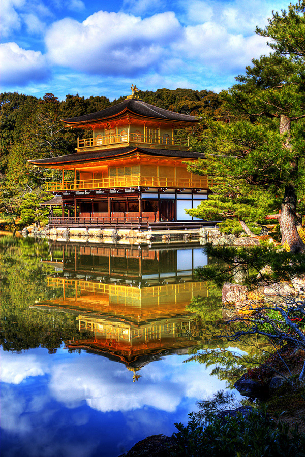 The Golden Temple and its reflection on a beautiful day in Tokyo.